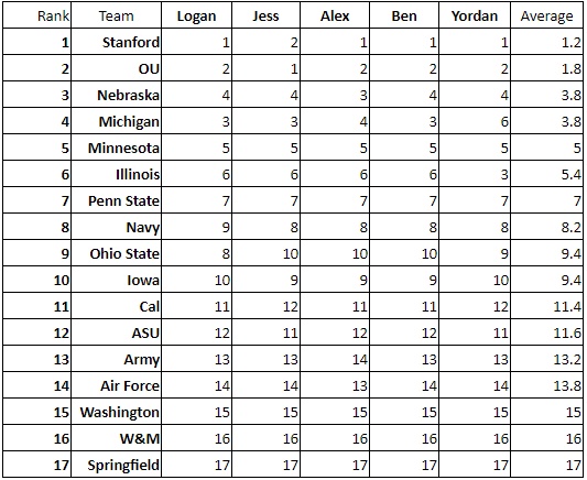 Oklahoma put up the nation’s top score for the second week in a row. So why aren’t they ranked No. 1? Much of it has to do with potential. The Sooners have shown an ability to hit and score well — a big accomplishment for this early in the season, though not out of the norm for OU. However, their room for growth seems slightly less in comparison to Stanford’s. If the Sooners deserve to be No. 1, they’ll have a chance to prove it this Saturday when they face Stanford and Cal in Palo Alto.