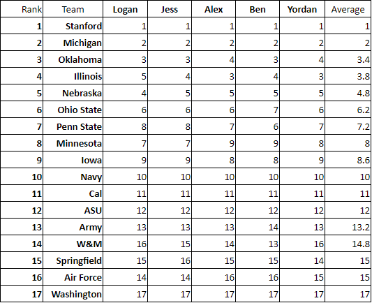 The Wolverines capped the first half of the season with a convincing defeat of Oklahoma, landing them in the No. 2 spot going into five-up, five-count format. The Wolverines appear to be the top dog in the Big Ten and the team best positioned to challenge Stanford. They take on Minnesota at home this weekend.