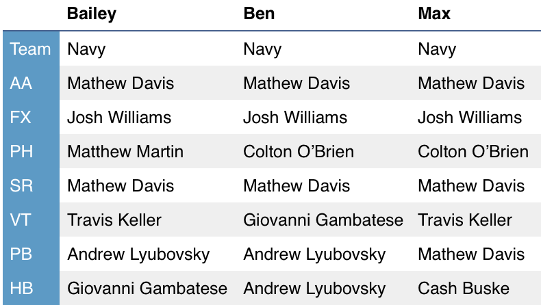 X-Factor gymnast: Travis Keller. Keller has been a consistent performer for Navy over the past four years and brings a wealth of experience and talent. He has put in upgrades on floor, vault, and parallel bars this year even with the lack of training due to COVID and has been a star for the Midshipmen. A strong showing from Keller will likely be indicative of a strong Navy performance.