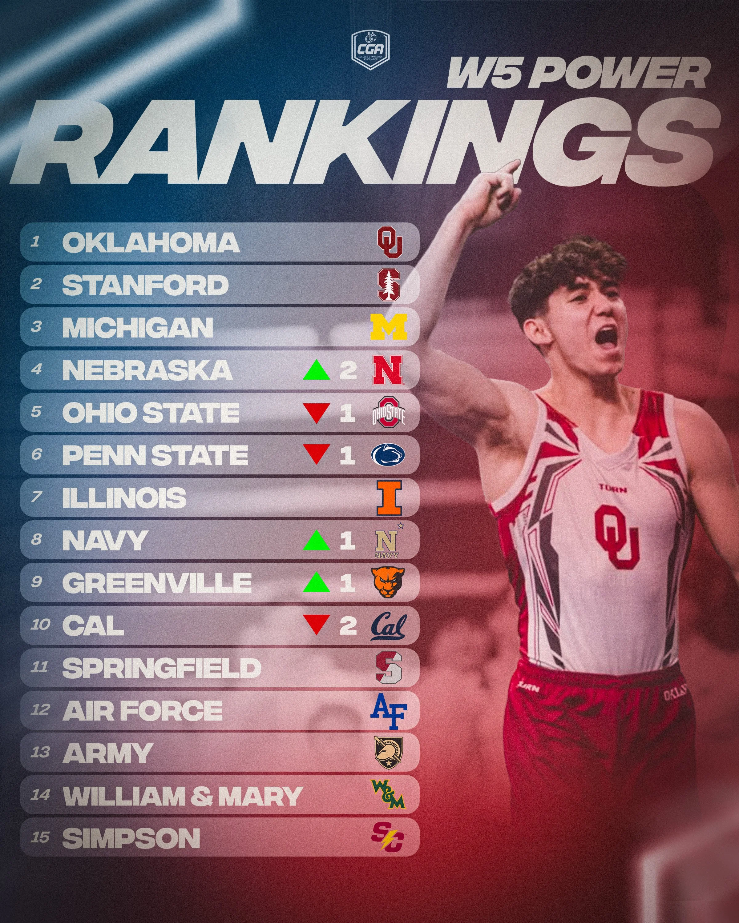 Oklahoma made a big statement this week, earning the nation's highest score. Mark Williams states, “ What I was most excited about from our past competition with Ohio State and Air Force was my team put up the highest score in the nation so far with a 328.650, hitting about 95% of our routines, and having some great performances from Fuzzy Benas, who did four events, Cobly Aranda from pommel horse, his first time in our field house scoring a 14.500, and Tyler Flores, who has come back from elbow surgery, and competed on three events very well. Overall, we had about 2,000 people. Our Cleveland Cubs were in attendance from the elementary school that we work with. So overall, it was a great competition.” Williams seemed pleased with his team’s performance and is ready for them to continue building towards the rest of the season. Key and consistent multiple-event performers like Benas and individual specialists like Aranda seem to be great contributors to Oklahoma’s success this season, as they are currently ranked first in the nation going into week six. The Sooners swept the MPSF Conference awards with Fuzzy Benas winning Gymnast of the Week, Colby Aranda winning Freshman of the Week, and Tyler Flores winning Specialist of the Week. During week five, Stanford had the opportunity to compete against Team Canada in Calgary, Alberta. This was a great experience for Thom Glielmi and his team as they competed against two rosters of high-level gymnasts at Elite Canada in an environment that most NCAA teams rarely get to see. Stanford put up a 321.465 here, counting some mistakes from their key players, but overall had a great competition with some of their top athletes competing. Asher Hong, Jun Iwai, and Nick Kuebler made multiple appearances in the Cardinal lineup, with very difficult gymnastics being performed. The Air Force Falcons got their highest team score this season with a 303.050 in their second competition of 2026. The Falcons have had a lot of injuries so far this season, most notably senior Denis Irimiea. Athletes like Tai Gopaul and Jared Fry have stepped up and were valuable parts of the Falcons' lineup in Norman this past weekend. Cal’s competition at Greenville wasn’t their strongest, registering their lowest team score of the season at 306.600. The Cal Bears will be looking to fix a lot of those errors for when they take on Stanford on February 28th.